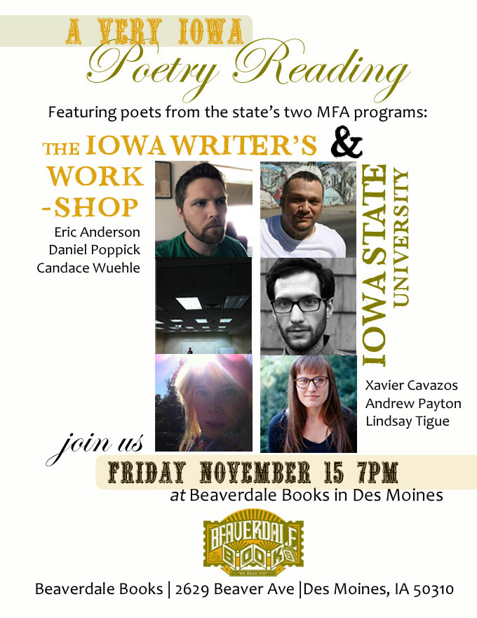 Friday November, 15 at 7:00 p.m. at Beaverdale Books in Des Moines. Poetry reading features Eric Anderson, Daniel Poppick, Candace Wuehle, Andrew Payton, Xavier Cavazos, and me. Should be a great event!
