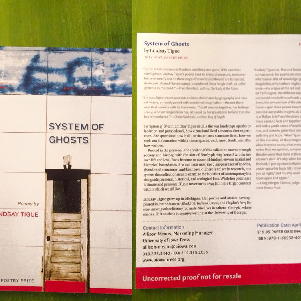 I was excited to finalize a trip home to my alma mater after System of Ghosts is released! I will be reading at the RCAH Center for Poetry at Michigan State University on Thursday, April 20. I will also be judging the Annie Balocating Undergraduate Prize for Poetry!